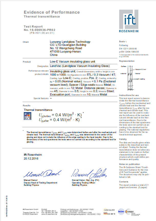 The comprehensive testing of LandVac VIG units by IFT Rosenheim underscores their superior performance and reliability. With an initial and post-load U-value of 0.4 W/(m²·K), these units offer exceptional thermal insulation. This makes them an ideal choice for energy-efficient buildings. Their robustness against mechanical and climatic stresses ensures long-term performance, justifying LandVac’s confidence in offering extended warranties for their products.